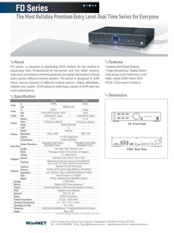 Win4net have finally made their entrance into the HD SDI DVR arena with their new 2 way HD-SDI recorder. This compact unit is the first 2 way unit in the market place and is looking to pick up on the upgrade business of HD CCTV over coax. Win4net have added the FD02 to their Trium range and this unit is designed to work on the NVMS software platform that has done so well for them with their traditional analogue DVR. In fact the plan for this little 2 way HD- SDI unit is to use two analogue outputs to link it up with existing systems currently running the software. This means the end user gets local HD quality recordings but still has the ability to have the cameras monitored remotely in an analogue format, meaning images stream easily to the central station not restricted by huge data bundles.